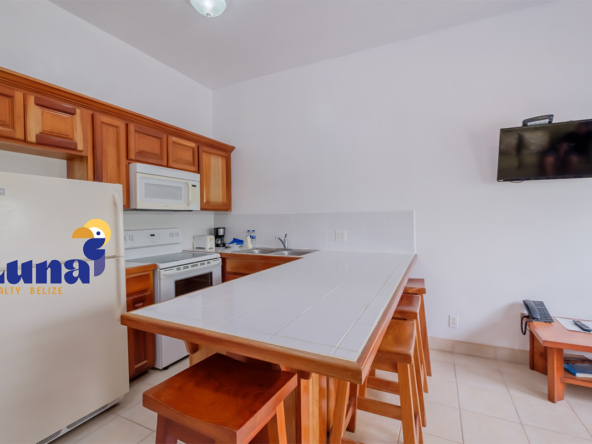 This condo has a full kitchen and is a true 1BR. The kitchen cabinetry, door frames, and doors are all customized for the condo and are beautiful local mahogany. All of the windows are Jeld-Wen, double-paned, impact-resistant windows proving extremely durable and stormproof.