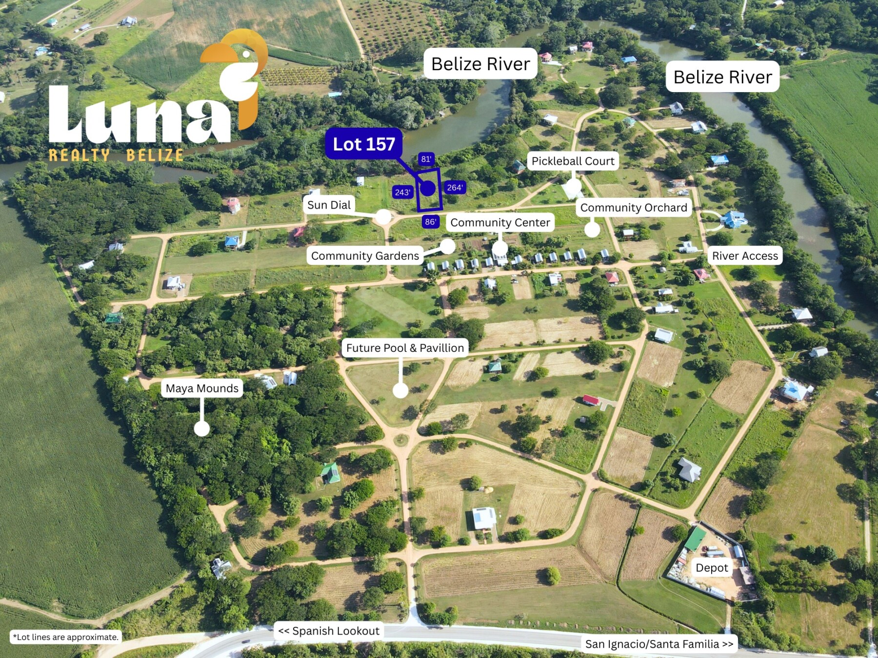 Lot 157 is a River Estate Lot with a stunning 76 feet of direct Belize River frontage. With mature trees along the shoreline and a blank canvas to build your dream home, this is a prime property. Plus, river access is right beside this property, making it effortless to enjoy kayaking, swimming, or simply relaxing by the water.