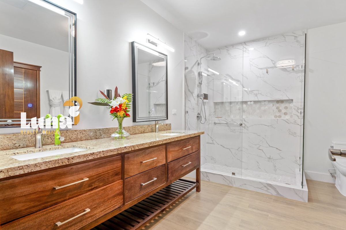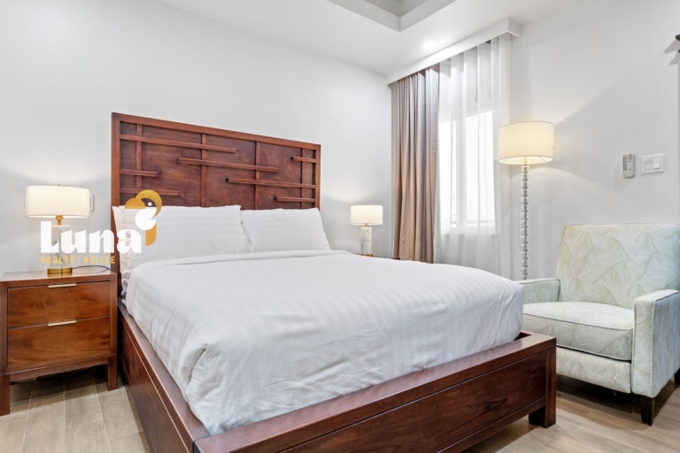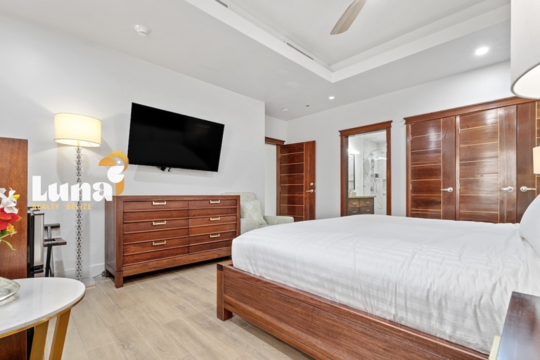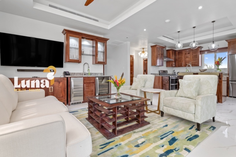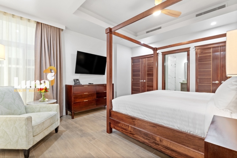 The residence features spacious living and dining areas, oversized bedrooms with en-suite baths, and a well-planned layout that provides privacy and flexibility for both owners and guests. Floor-to-ceiling glass doors open to a private balcony, inviting in natural light, ocean breezes, and partial Caribbean views that enhance the indoor-outdoor flow throughout the home.
