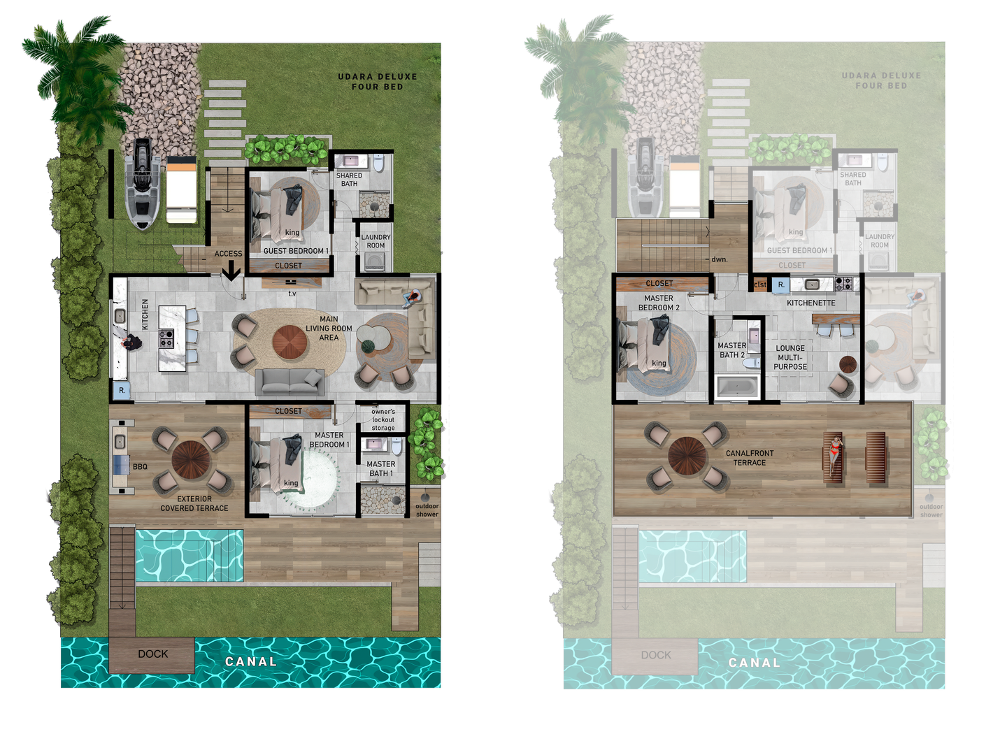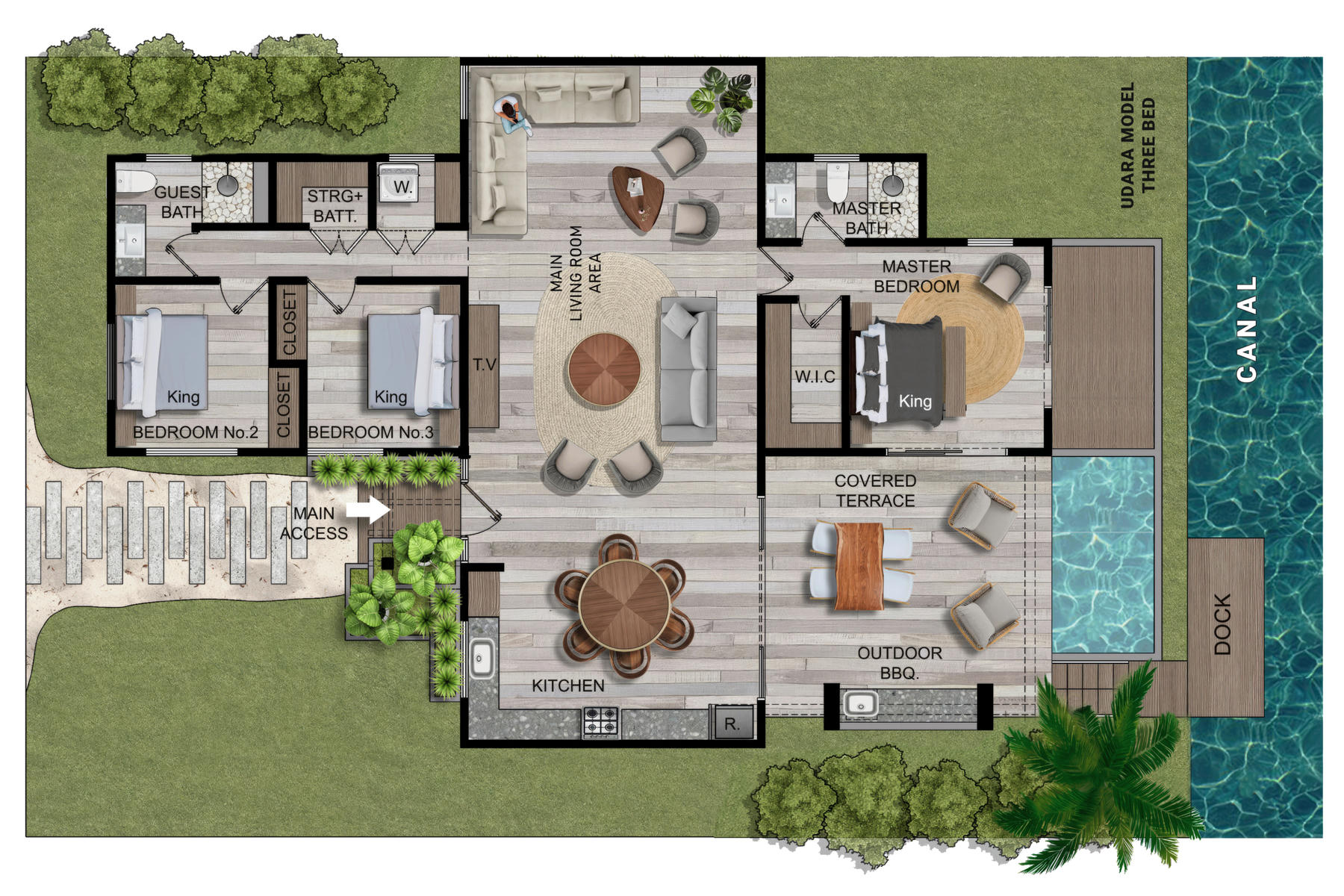 The spacious Udara single-family homes feature highly sought-after features including a private pool, a private covered terrace overlooking the canals, 3 bedrooms, an incredible master bedroom featuring water views and a walk-in-closet, an outdoor BBQ area, and more.  Offering a large living and dining area, this villa is perfect for those looking to find home in paradise or investors who want to cater to the rental market.