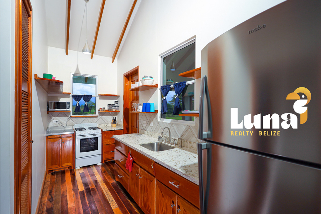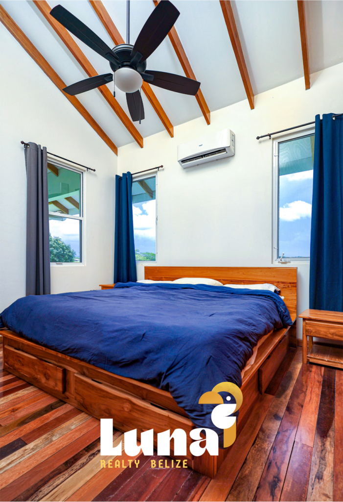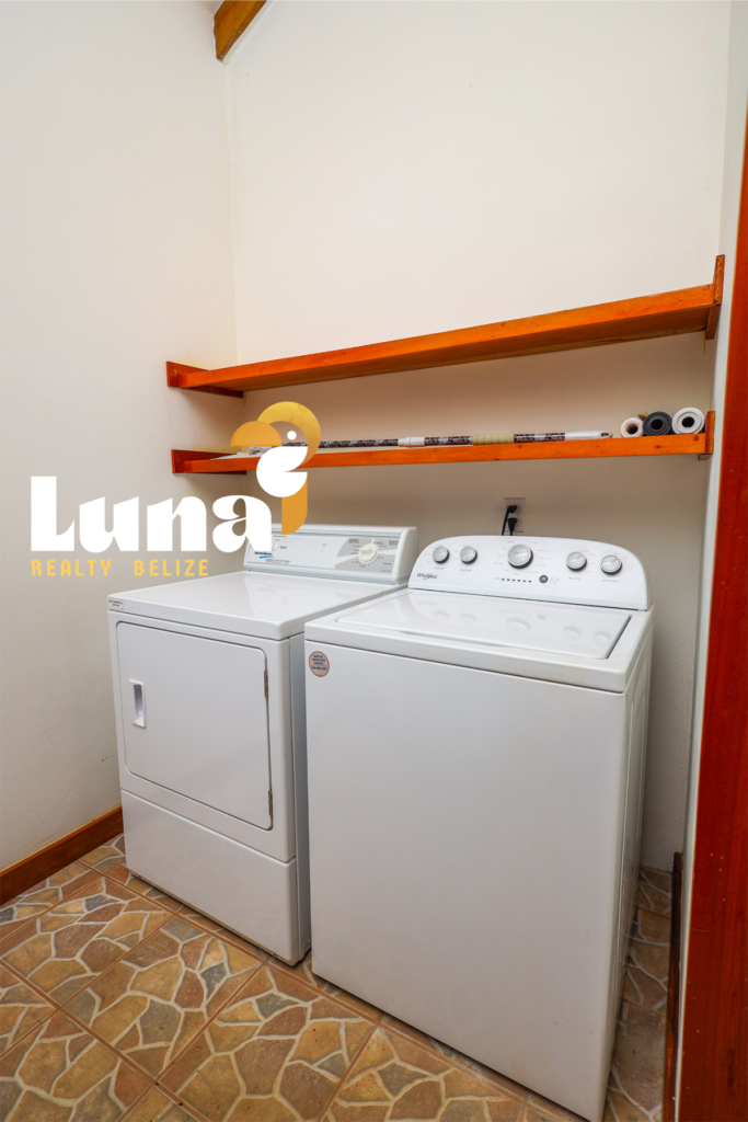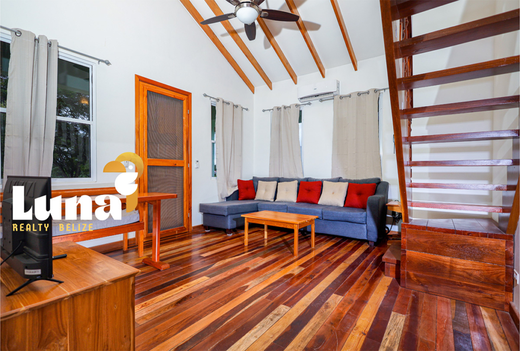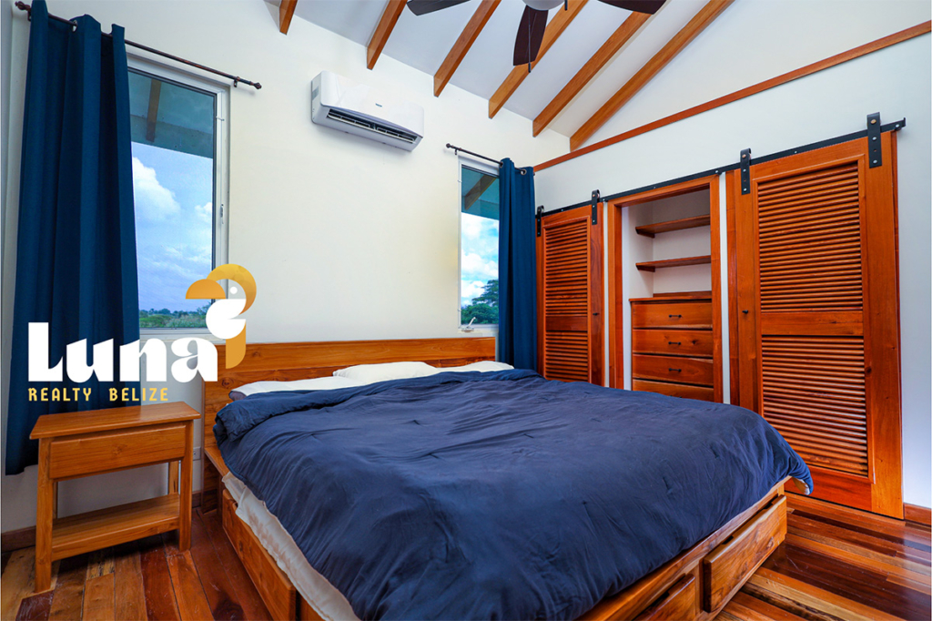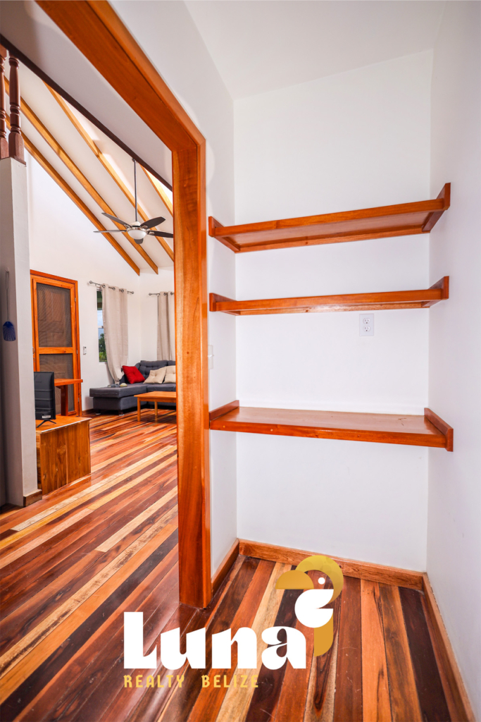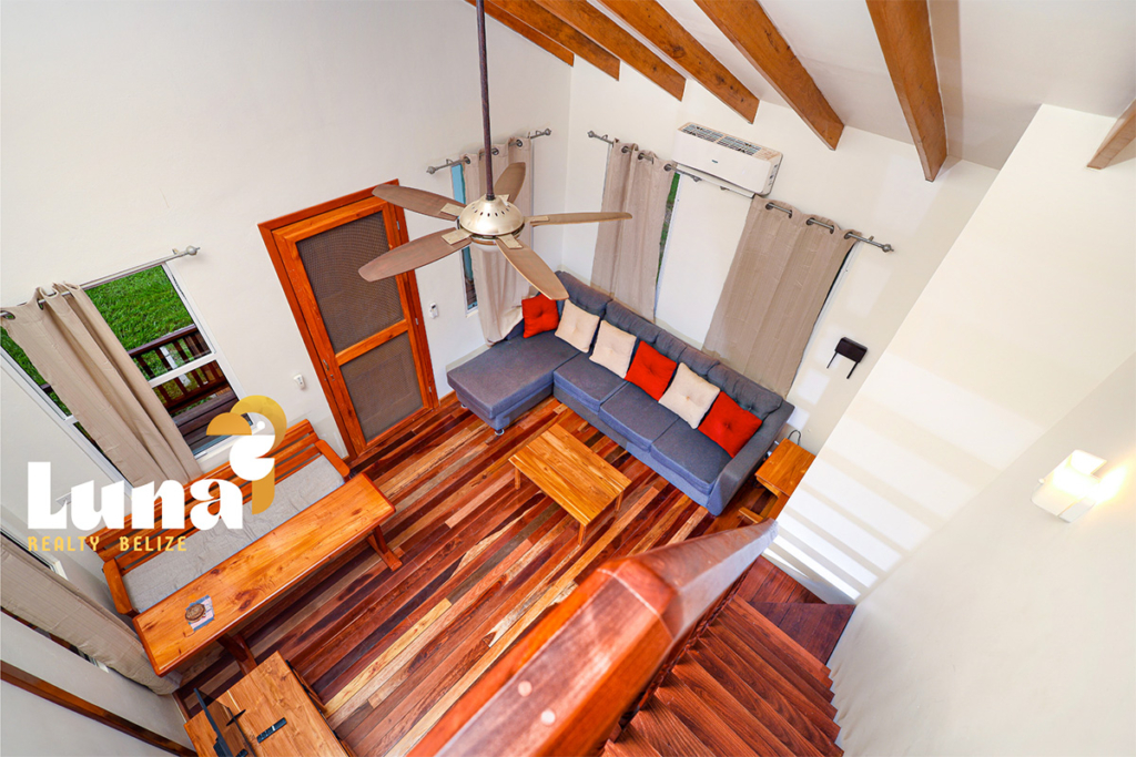 Within the home you have two full bathrooms, two bedrooms, a loft space (for guests, an office, or for your extra stuff), and a full-sized laundry room already equipped with a washer/dryer. Throughout the home you’ll notice beautiful Belizean hardwood features including custom cabinetry, hardwood floors, doors, furniture, and ceiling beams. Each room has split air conditioner units.