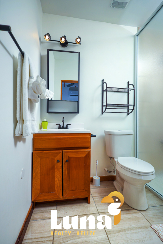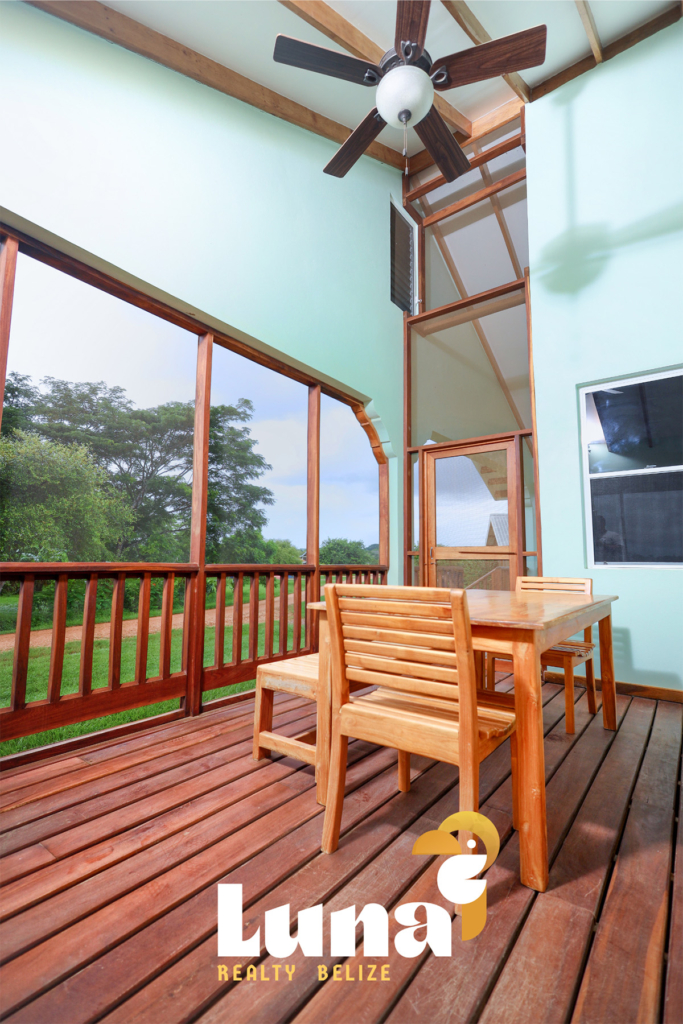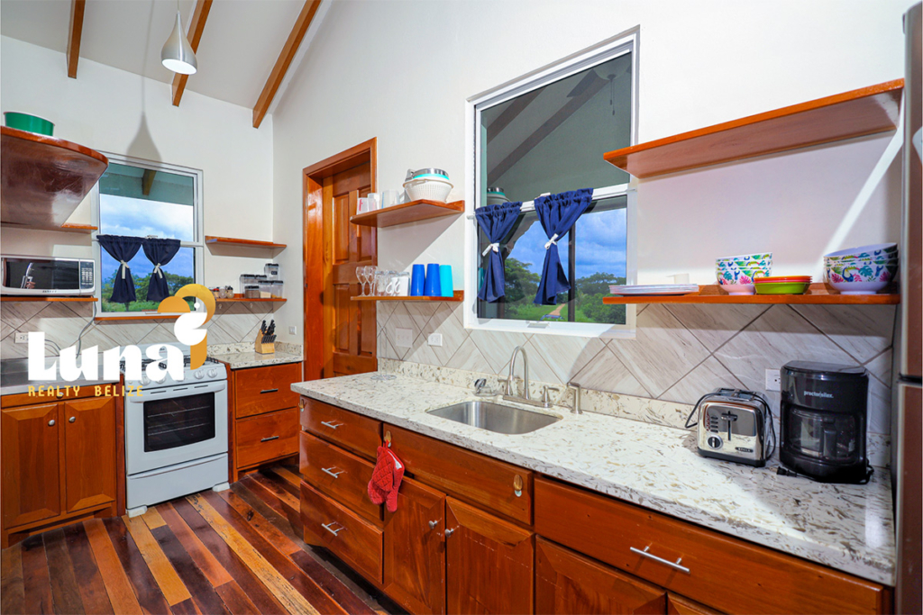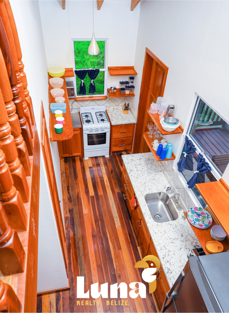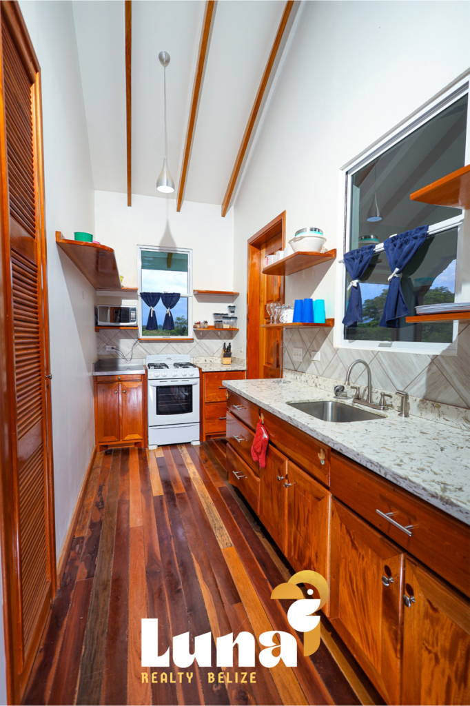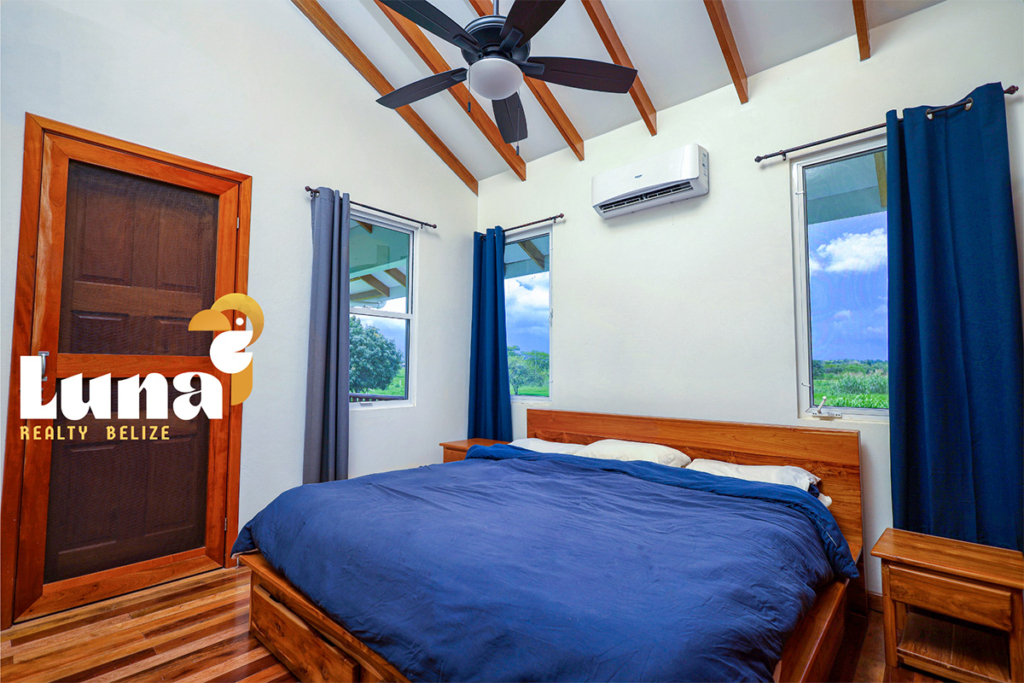 Within the home you have two full bathrooms, two bedrooms, a loft space (for guests, an office, or for your extra stuff), and a full-sized laundry room already equipped with a washer/dryer. Throughout the home you’ll notice beautiful Belizean hardwood features including custom cabinetry, hardwood floors, doors, furniture, and ceiling beams. Each room has split air conditioner units.